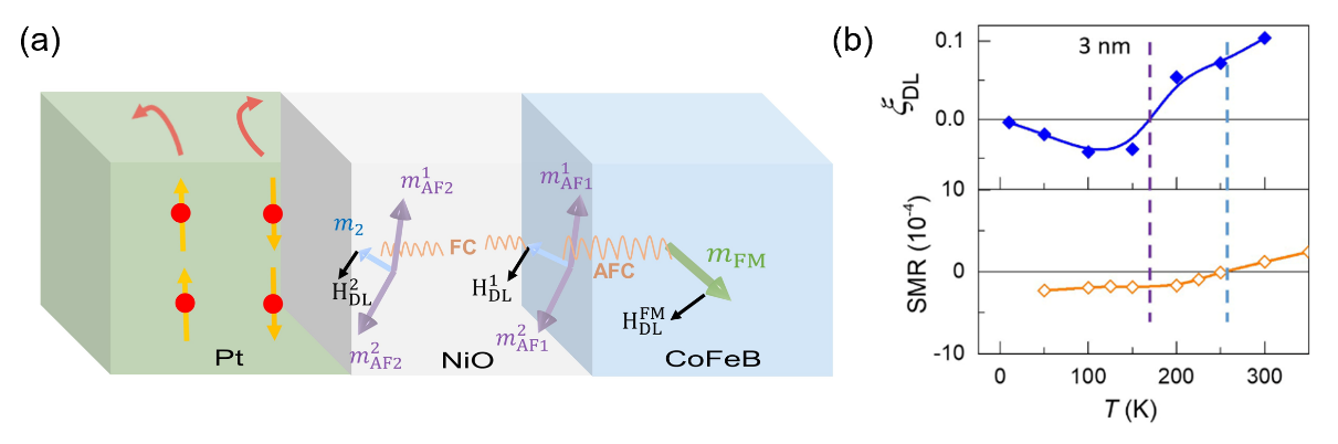 图1:(a)反铁磁/铁磁界面耦合以及反铁磁体内交换耦合传递自旋轨道矩的示意图。(b)Pt/NiO(3 nm)/CoFeB结构中类阻尼自旋轨道矩以及自旋霍尔磁电阻随温度的变化。
