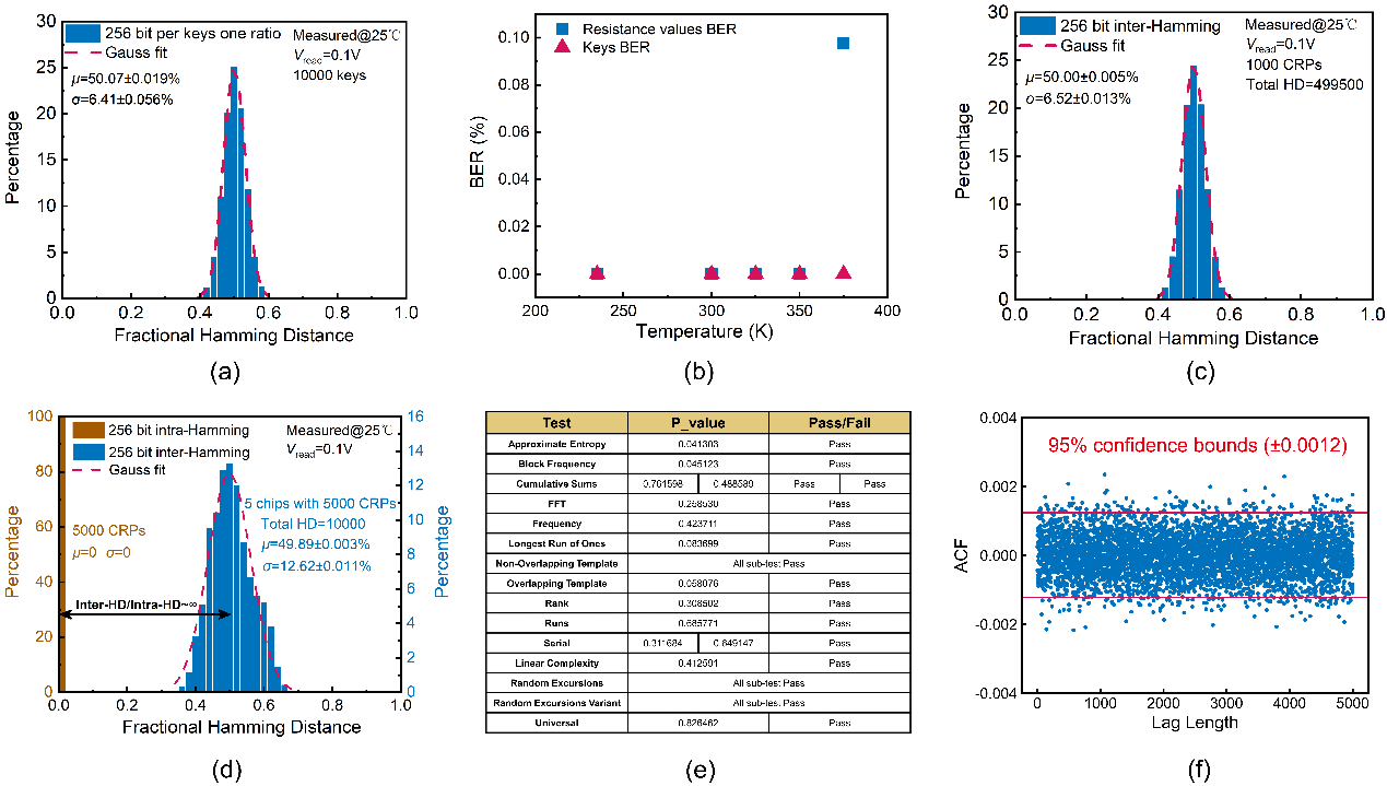基于上述原因,研究团队开发了一种以阵列单元阈值电压差异为熵源,具备高可靠性和可重构性的强SOT-MRAM sr-PUF,其特性总结如图1所示。所提出PUF的实现过程分为两步,如图2所示。首先,对整个芯片进行初始化操作,将阵列上所有单元设置为高阻态或低阻态。接着,对所有单元施加特定的写入电压,使得阵列中高阻态和低阻态的出现概率接近50%。最后,采用存内计算方法,通过比较不同列组合的电流和生成PUF响应。实验结果证明,SOT-MRAM sr-PUF无需额外的纠错电路或辅助设计,可以直接通过存储芯片实现。值得注意的是,SOT-MRAM sr-PUF拥有极大的挑战响应对(CRPs)空间(∼109),并且所有性能指标接近理想基准,尤其是在375K下仍能实现100%的可靠性,如图3所示。通过对写入电压施加微小变化,SOT-MRAM sr-PUF成功实现了CRPs的可重构操作。此外,所提出的PUF还表现出对逻辑回归、支持向量机和多层感知器等机器学习算法建模攻击的抵抗力。