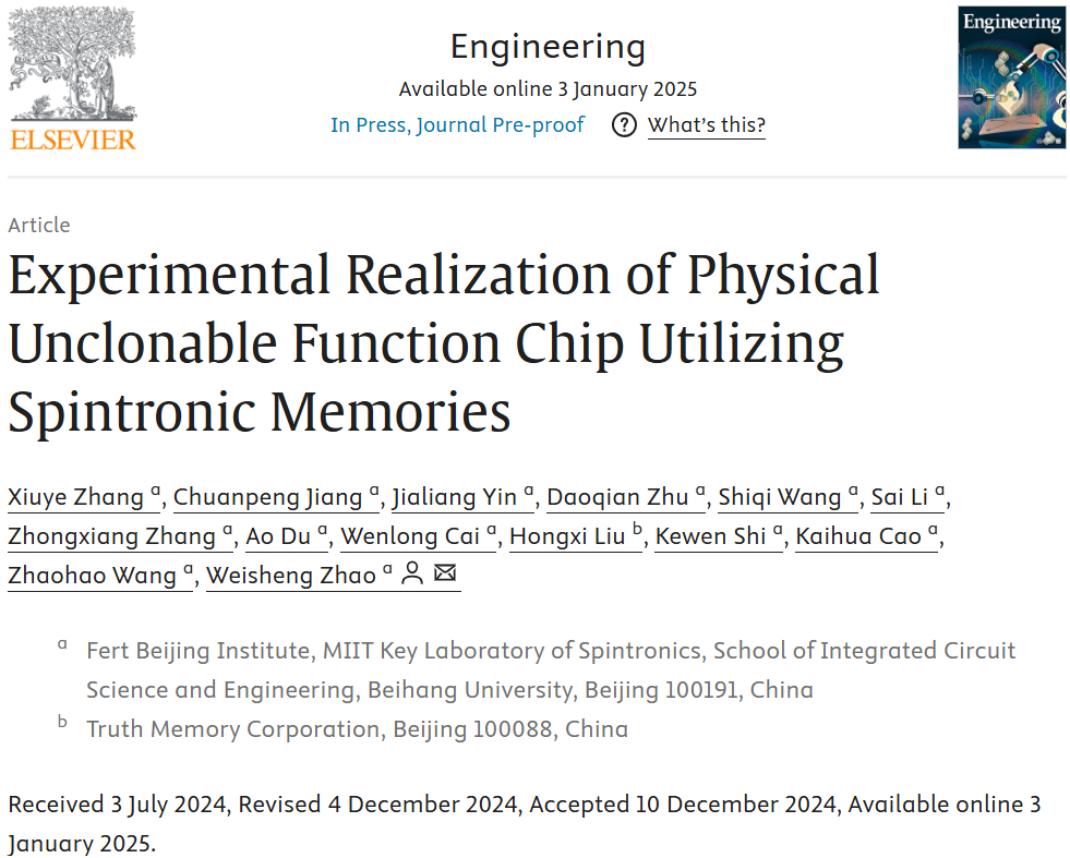 2025年1月3日,中国工程院院刊《工程》(Engineering)在线发表了北京亚州怡红院集成电路科学与工程学院赵巍胜教授课题组的最新研究成果《Experimental Realization of Physical Unclonable Function Chip Utilizing Spintronic Memories》。该工作首次实现了一种基于自旋轨道力矩磁随机存储器(SOT-MRAM)的高可靠且可重构的强物理不可克隆函数(sr-PUF)。所提出的PUF在具有接近理想性能参数的同时,还具备抵抗机器学习模型攻击的能力,为未来物联网边缘端设备的硬件安全问题提供了一种全新的解决方案。我院2022级博士生张秀野为第一作者,赵巍胜教授为通讯作者。该工作获得了国家重点研发计划和国家自然科学基金等项目的支持。