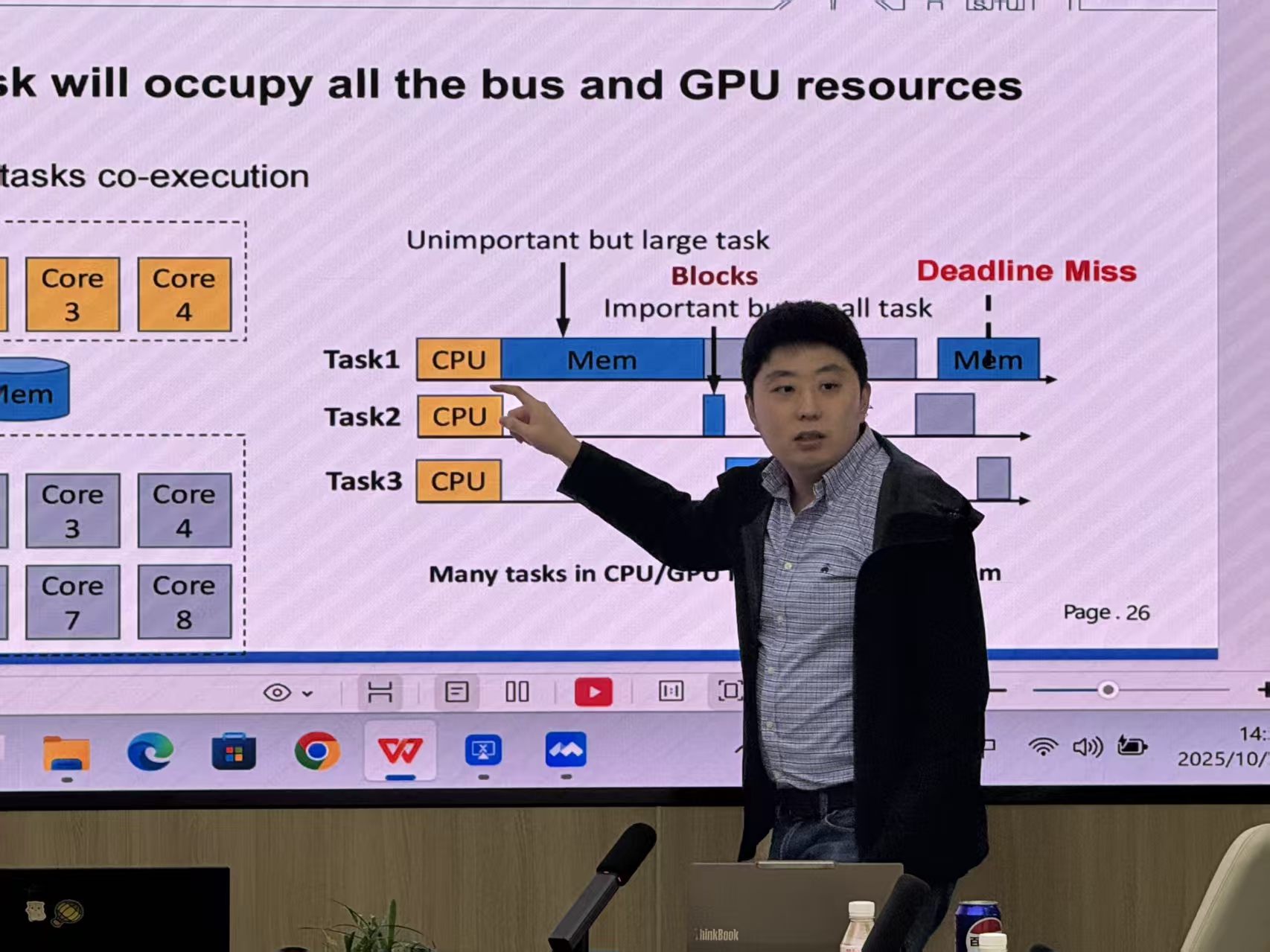 上海交通大学邹桉副教授从实时计算的任务需求出发,深入解析了GPU与专用加速器在并行架构、内存层次与计算单元设计上的特点与局限。他重点探讨了在动态与不确定负载下,如何通过硬件感知的静态与动态任务调度策略,保障关键任务的时序确定性。报告为在复杂异构平台上实现高效率、高确定性的并行处理提供了从架构到调度算法的系统级见解。