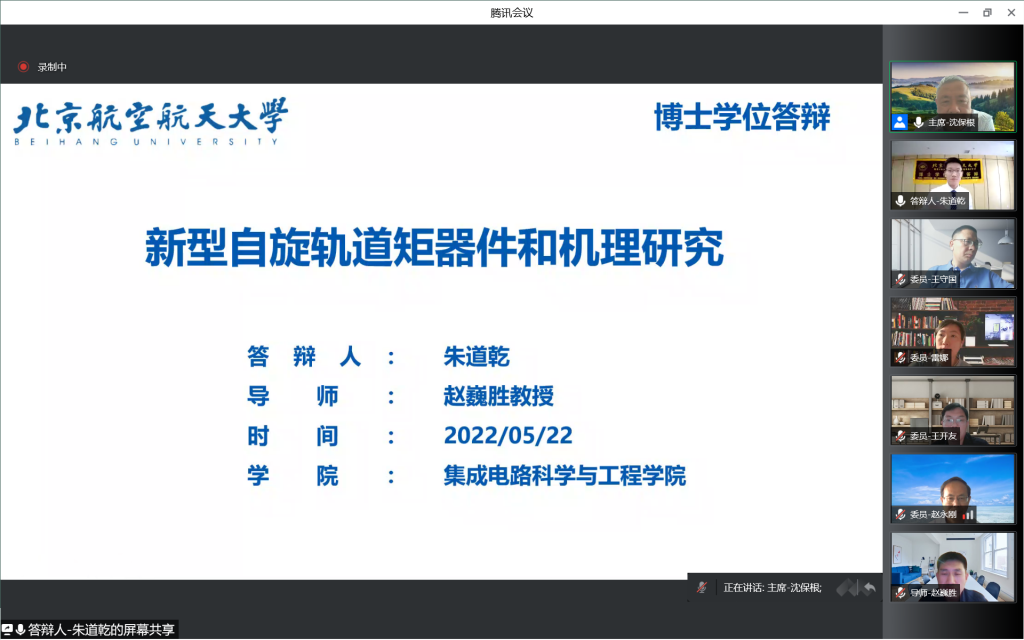 2022年5月22日下午,学院赵巍胜教授团队两位博士研究生李赛、朱道乾(均为北航博士研究生十佳获得者)进行了线上博士学位论文答辩,并顺利通过答辩,成为集成电路科学与工程学院在疫情防控期间首批通过线上完成学位论文答辩的博士生。