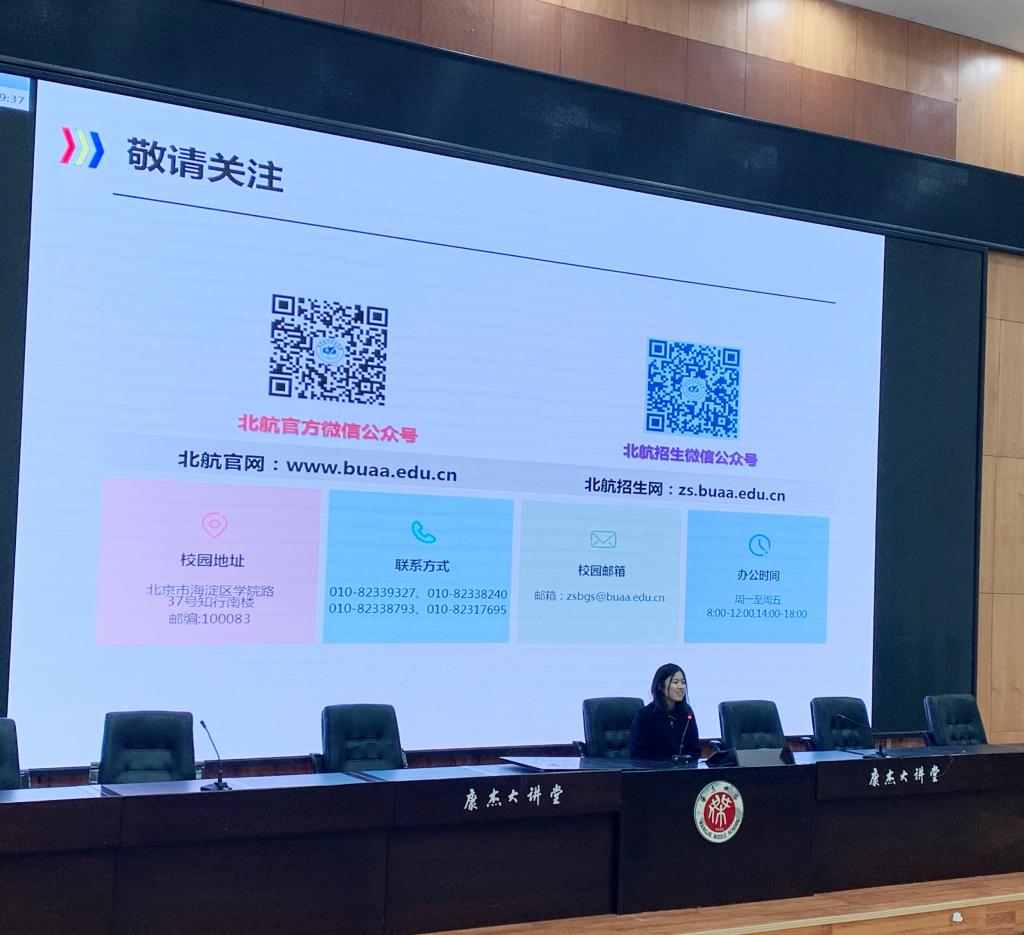 胡远奇教授为同学们带来了主题为“报‘校’祖国  专‘芯’学习”的精彩报告,向同学们介绍了北航的历史、风貌及招生政策,同时生动地讲解了微电子科学在现代信息社会中的重要性,鼓励同学们在高中学习中打下坚实基础,争取加入北航,成就自我,报效祖国。