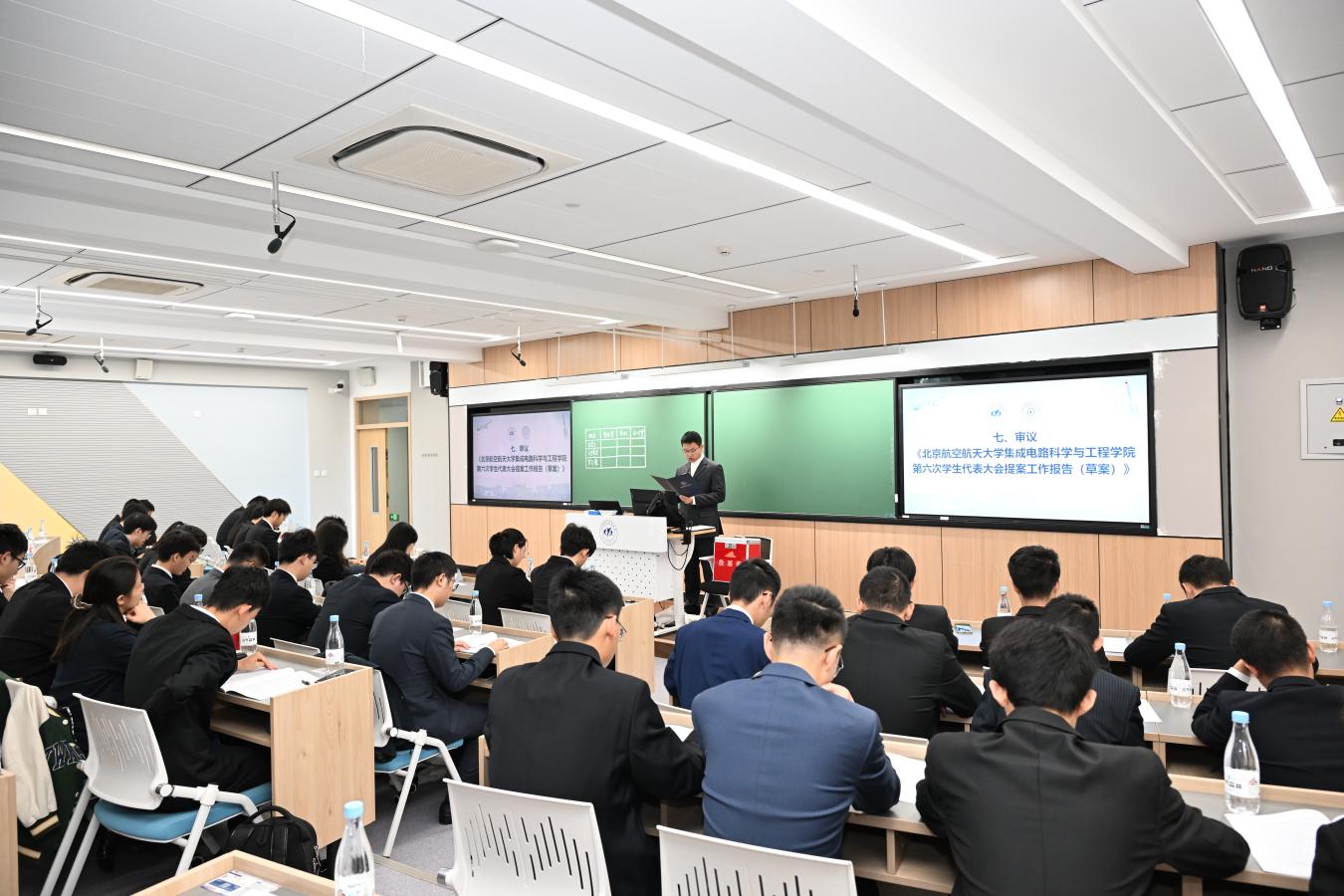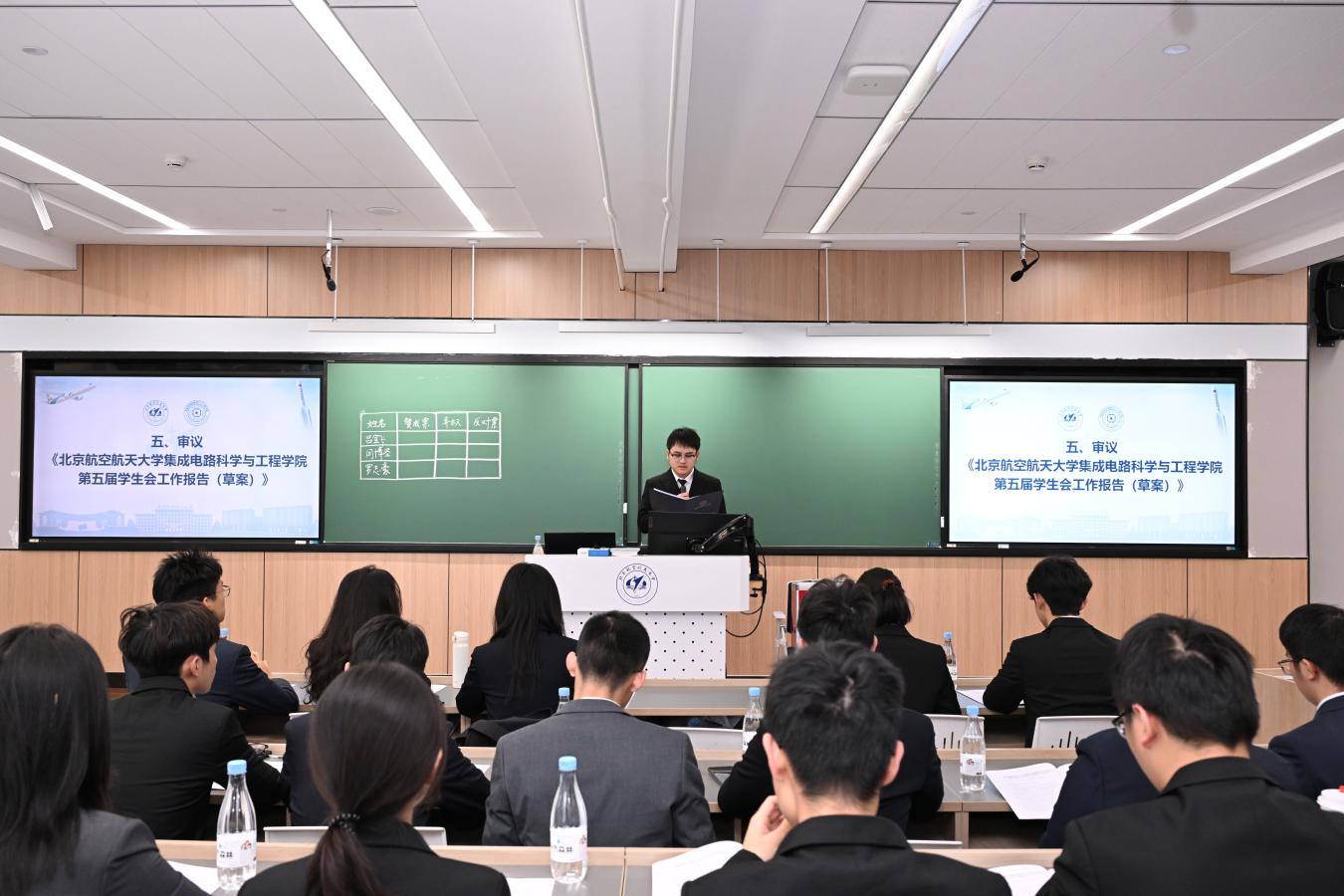 学院第五届学生会主席团成员徐汉俊向大会作《学生会工作报告(草案)》。在过去一年中,北航集成电路学院学生会积极弘扬学院文化精神,通过系统性优化组织架构、推动多角色协同与分部门高效协作,构建起全方位的服务网络,在学风建设、文体活动等方面取得显著成效。展望未来,学生会将继续坚守以“矢志不渝、敢为人先、致真唯实、芯片报国”为核心的北航“芯”精神,全心全意服务同学,深度融入学院人才培养工作全局,贡献集成电路青年的智慧与担当。